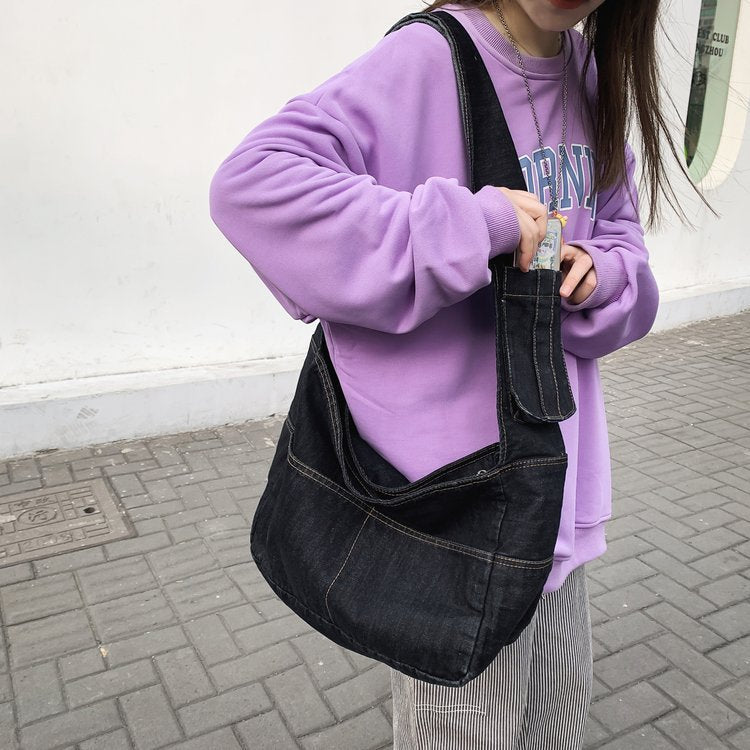 This multi-pocket denim crossbody bag blends style and function for everyday convenience. The oversized main compartment fits books, tablets, water bottles, cosmetics, and more, while the secure front pocket keeps your phone within easy reach. Made from denim with reinforced stitching, this bag is lightweight, comfortable for all-day wear, and effortlessly matches casual or streetwear outfits.